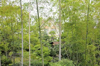 水野勝成公像が存在の広場から北側に眼を向けますと、竹藪の中に「福寿会館」の建物が(^-^)