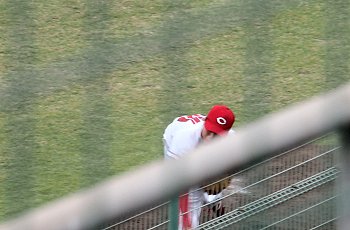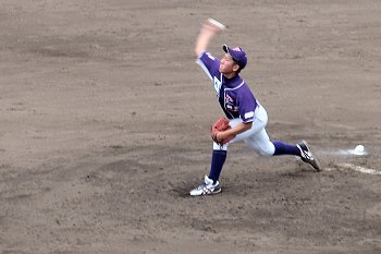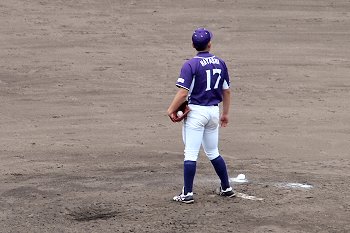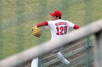 ネットサイドでは、背番号「120」番の岡崎投手が投球練習です。