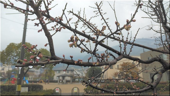 畑では、梅の蕾が雨しずくを付けて…よくよく見ますと、開花の訪れも遠くなさそうでありました。