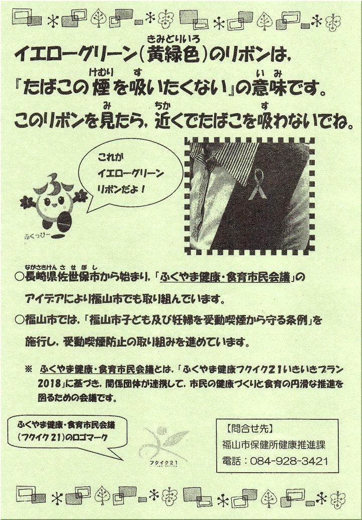 イエローグリーン(黄緑色)のリボンは「タバコの煙を吸いたくない」という気持ちをさりげなく周りの人に伝えるためのものです。