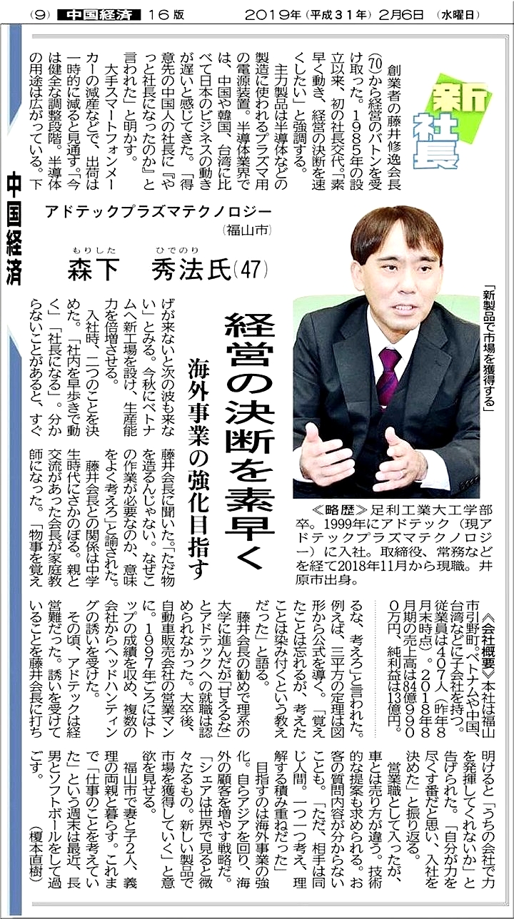森下 秀法氏(もりした・ひでのり)94年足利工大(現足利大)工卒、広島トヨタ自動車入社。99年アドテックプラズマテクノロジー入社。12年取締役、17年常務。岡山県出身。47歳。