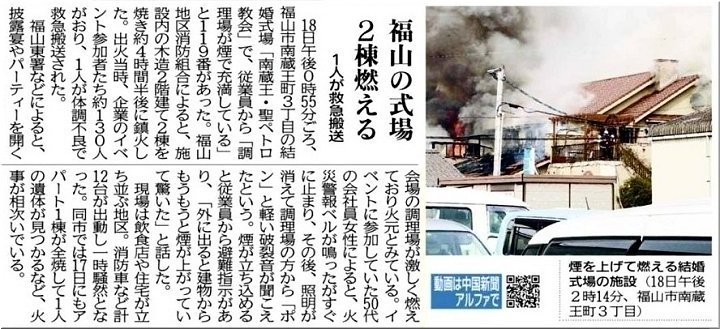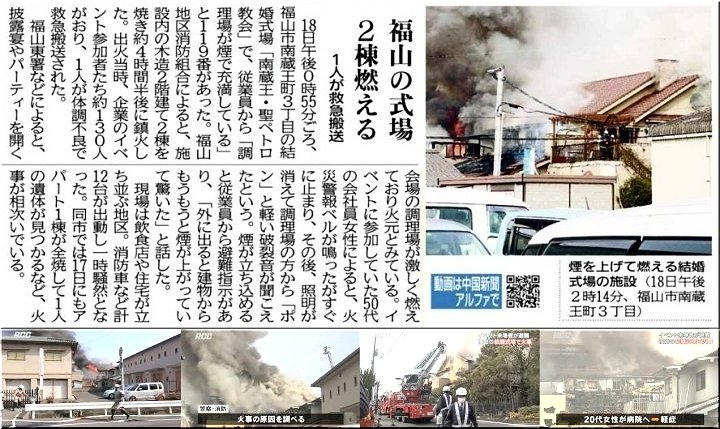 これは、今朝の中国新聞sanの朝刊記事なんですけど、う〜ん、また、一昨日(2/18)の南蔵王町結婚式場火災記事の掲載がありました。