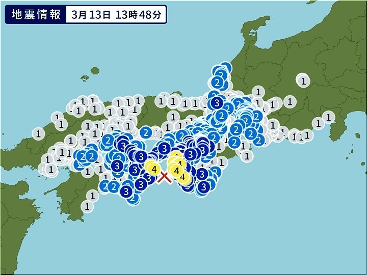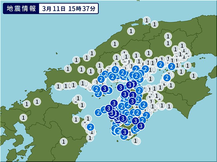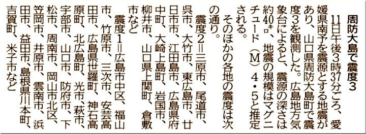 新聞によりますと、昨日の地震の震源地は愛媛県南予でしたとか…で、震度は「3」でありました。