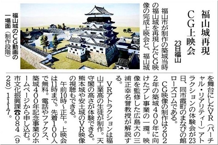 今朝の中国新聞朝刊に、こんな記事掲載がありました。ふ〜ん、「福山城再現CG上映会」ですか…