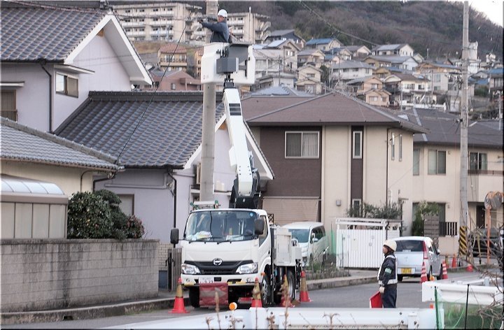 我が家近くまで戻って来ましたら、電話線工事なのかも…工事の様子を2枚ばかりパチリ。その際に、工事の方と視線が合ってしまいましたネ(^-^)