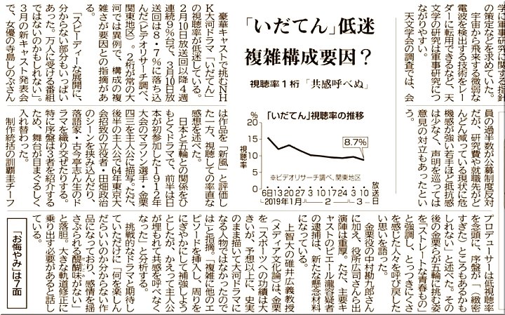これは、昨日・日曜日(3/17)の中国新聞朝刊記事なんですけど、ふ〜ん、NHK大河ドラマ「いだてん」の視聴率は1桁台なんですか…
