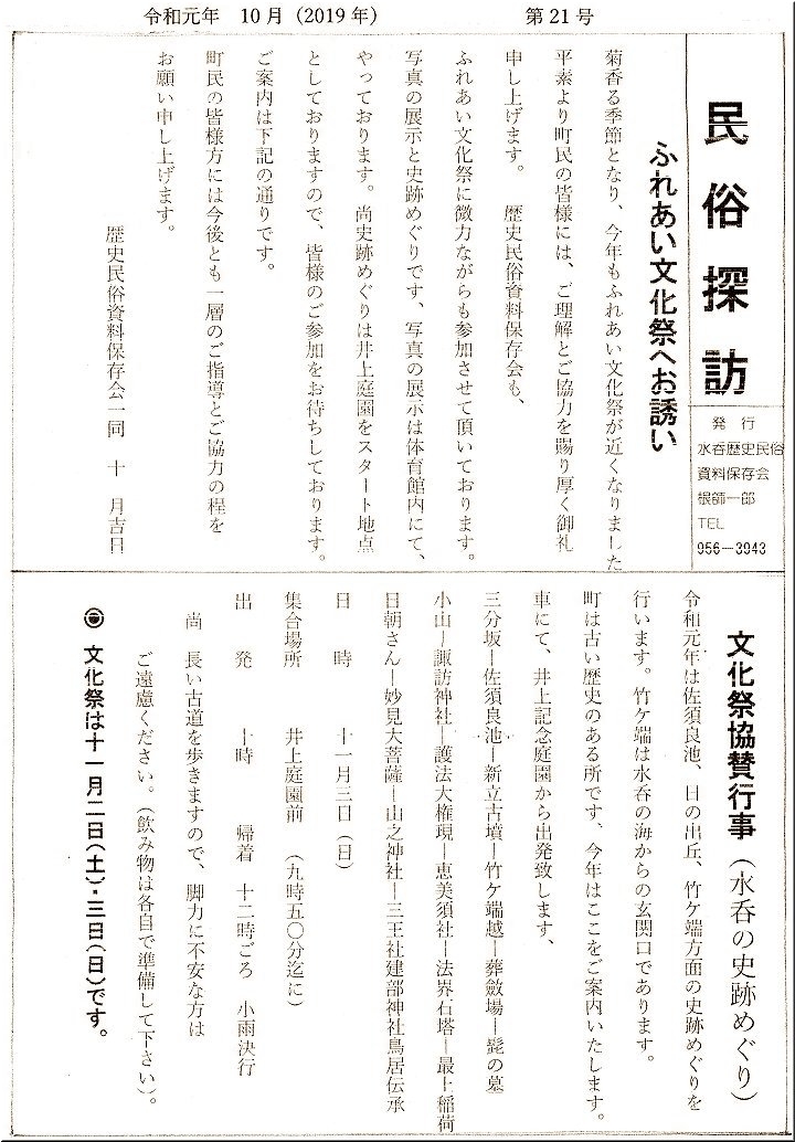 今年の「ふれあい文化祭」は、11/2(土)〜11/3(日)の開催のようですネ。毎回、GONsnnは「水呑の史跡めぐり」と、体育館内での「作品展(絵画・写真・工芸・書・手芸…等)」を楽しんでおりますけど、史跡巡りの方は、数年毎に同じコースを歩きますから、今回は、どうしたものかと(^-^)