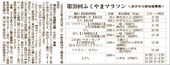 「第39回ふくやまマラソン」の参加者募集…11/1(金)から受付開始のようですネ。開催日は、来年の3/15(日)。