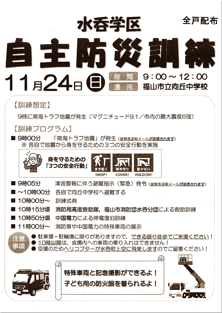 これは、本日、町内会の回覧で廻って来ました案内文ですけど、11/24(日)は、「水呑学区自主防災訓練」が実施されますようです(^.-)☆
