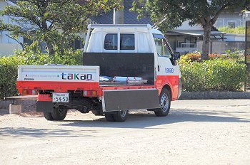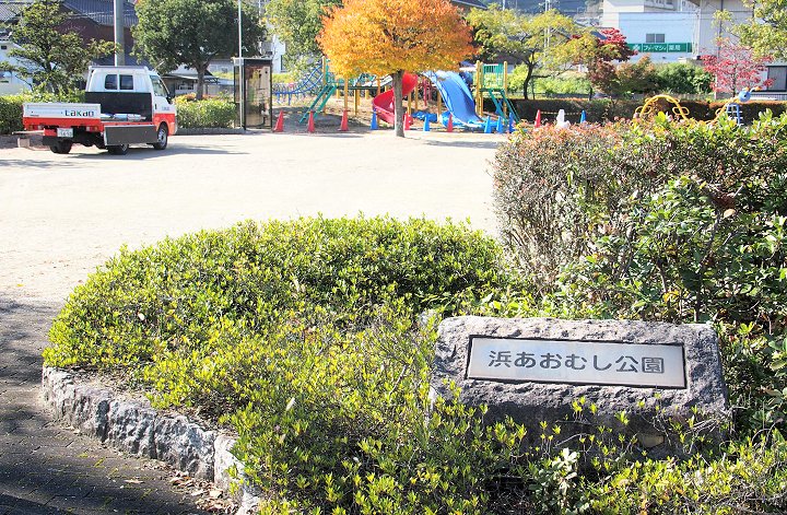 午前中に草取りでもしようか…と、一服しながら「浜あおむし公園」に視線を向けておりますと、眼の前にタカオ郭anの車が停車。そして、車から降りられました社員sanが公園入口の車止めの施錠を解除。そして車で公園内に…