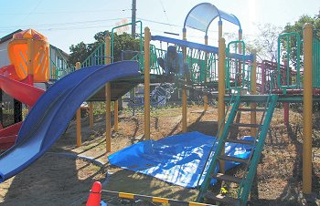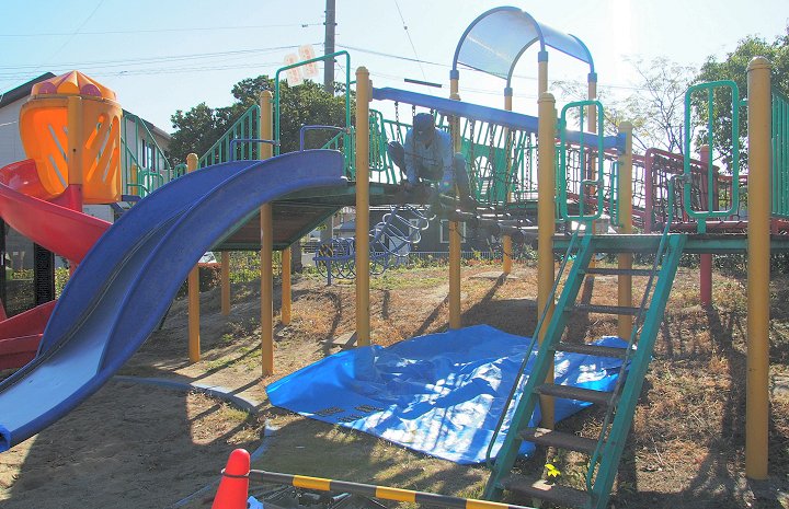 この公園内の遊具は老朽で3〜4年前に使用禁止となりまして、ブルーシートが被せてありました。