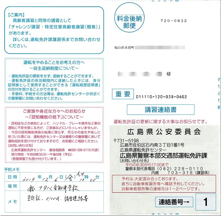 本日、「はい、郵便物(^-^)」と、嫁さんから手渡しの郵便物に眼を向けますと、『高齢者講習のご案内』でありました(^.-)☆