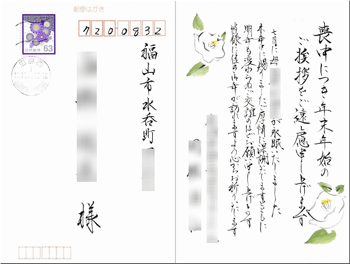 毎年、賀状は自筆の毛筆書きで頂きますが、喪中のご連絡も勿論、毛筆書きでありました。