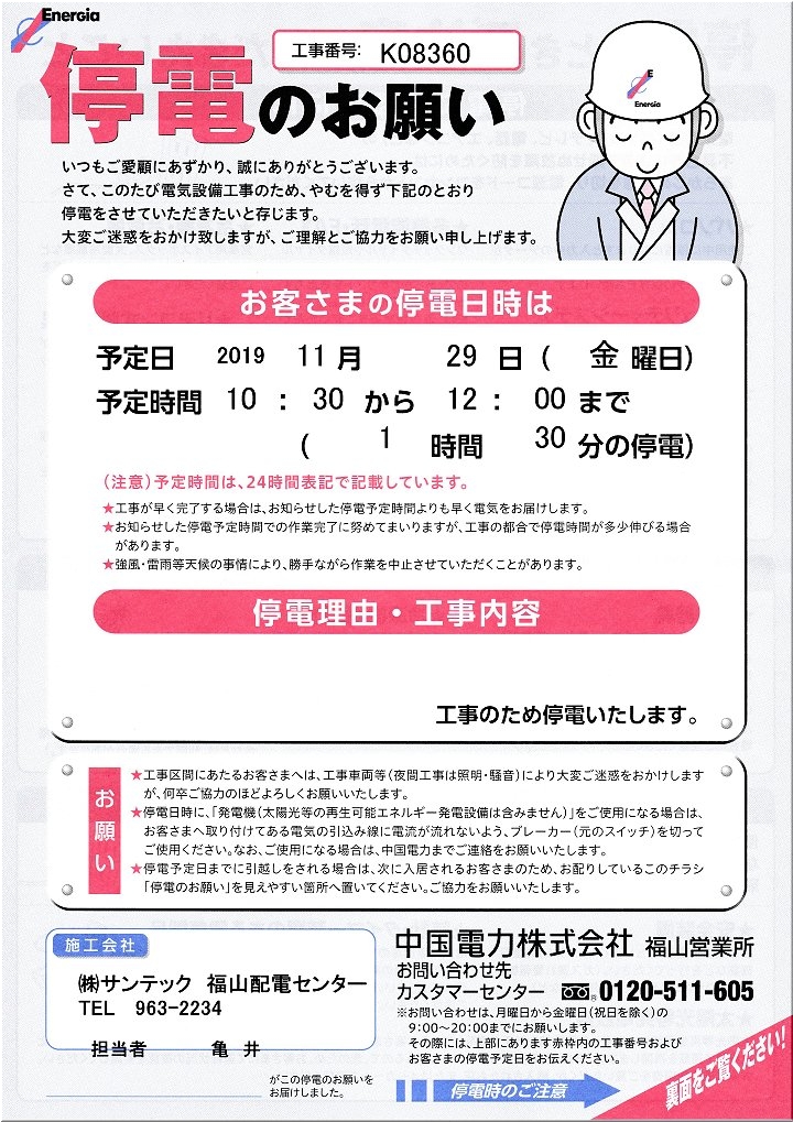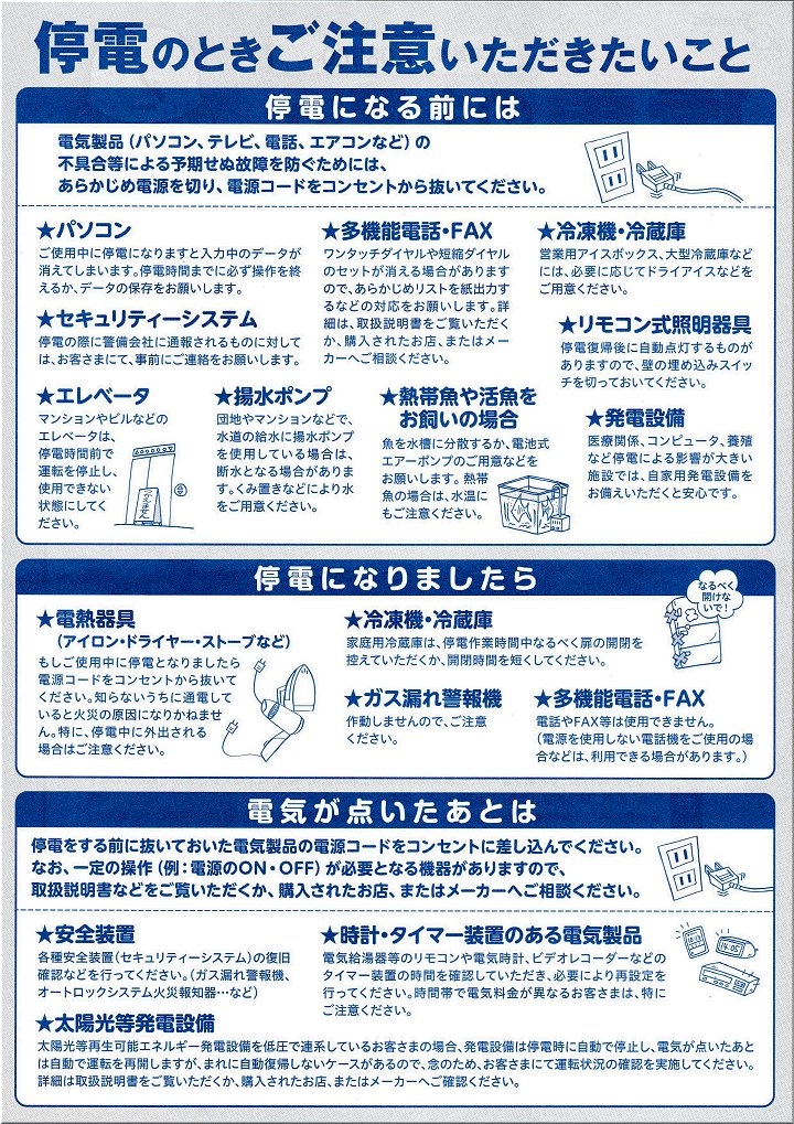 本日、郵便受けに投函されておりましたのが「停電のお願い」でありました(^.-)☆