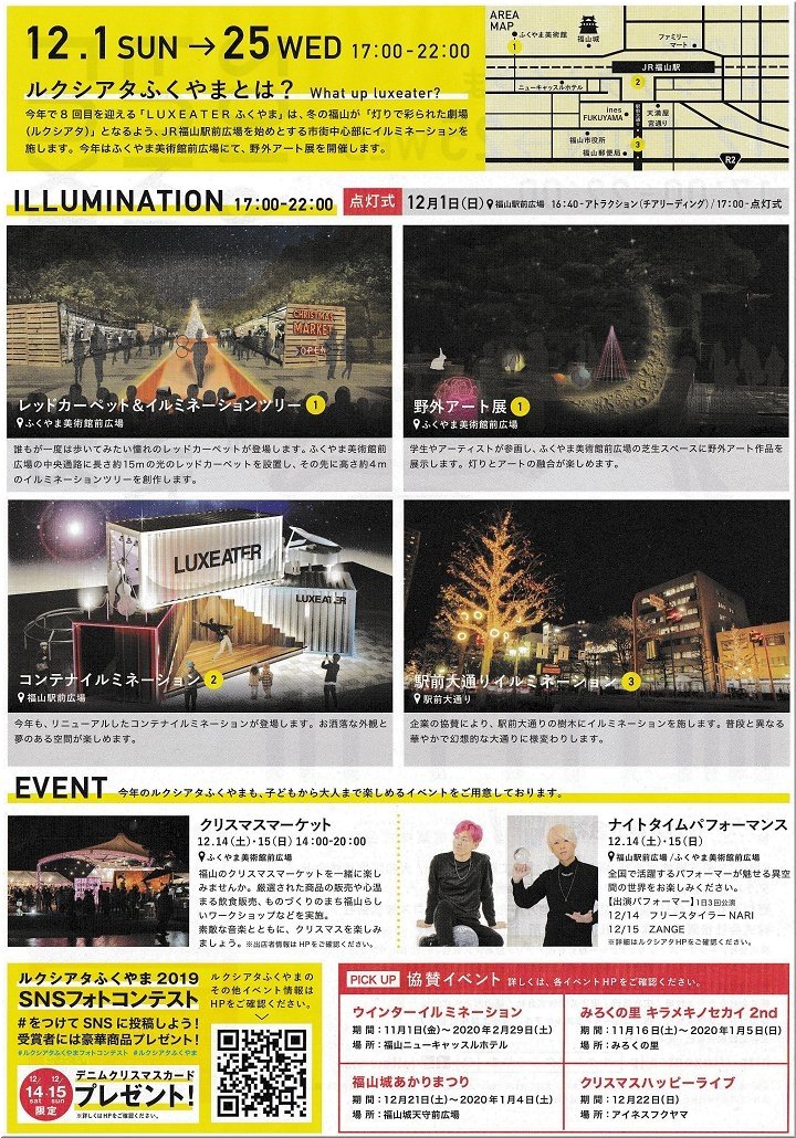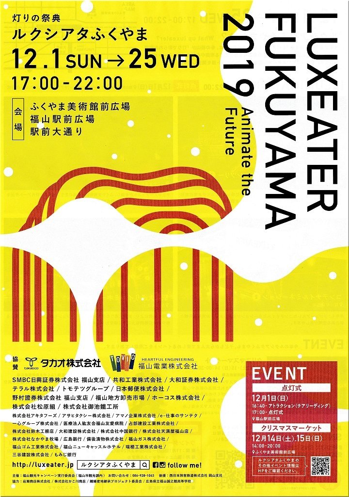 今朝の新聞折り込みチラシの中に入っておりましたのが、「LUXEATER FUKUYAMA 2019」のご案内。ふ〜ん、今年は、12/1(日)〜12/25(水)間の開催のようですネ(^.-)☆