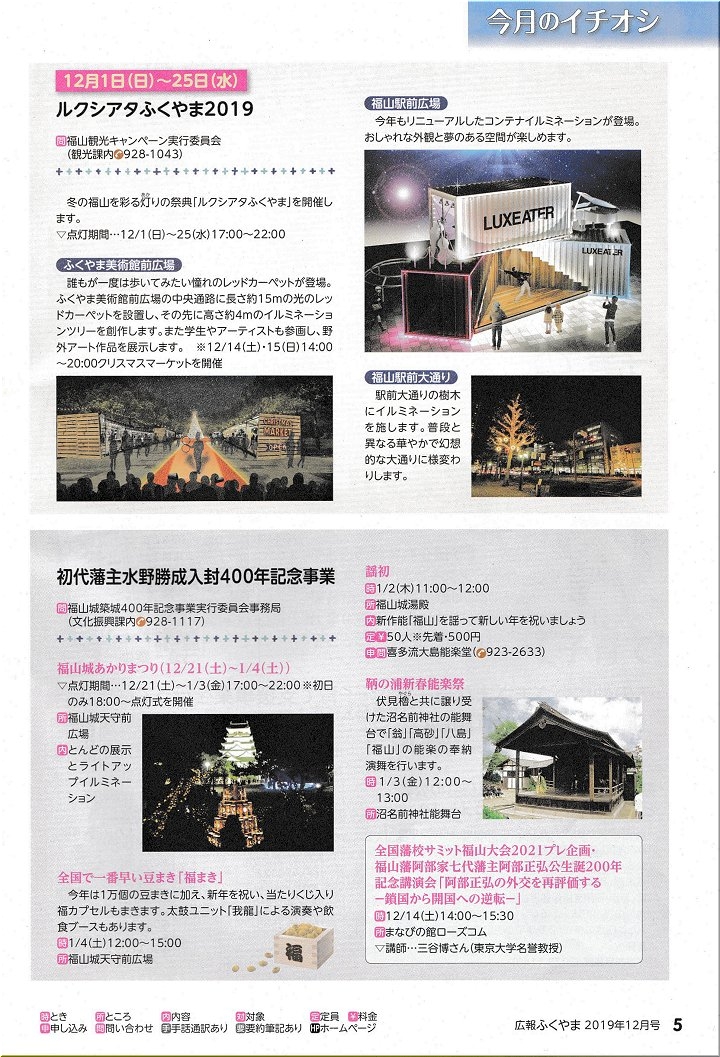 これは、市の広報誌「広報ふくやま12月号」に掲載のイベント案内ですけど、ルクシアタふくやま2019…始まりましたネ(^.-)☆