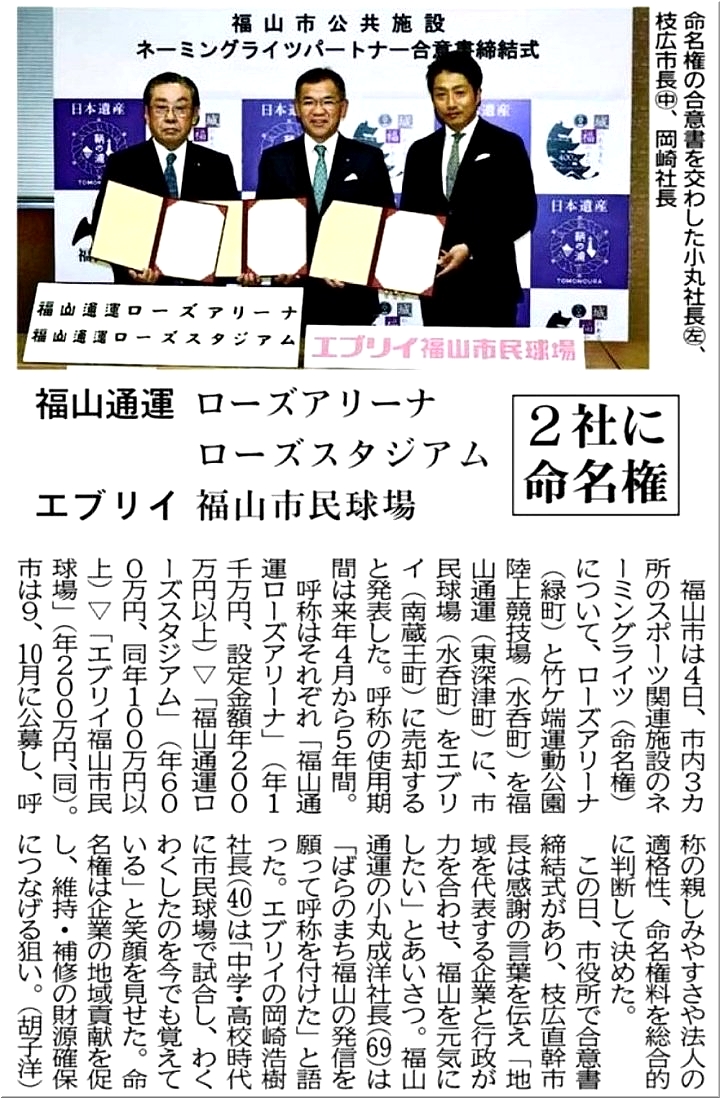 これは、本日(12/5)の中国新聞朝刊記事なんですけど、福山市のスポーツ関連施設であります「ローズアリーナ」「竹ヶ端運動公園陸上競技場」「福山市民球場」の3施設の命名権を福山通運san、エブリィsanの2社に売却が決まりましたようですネ(^.-)☆