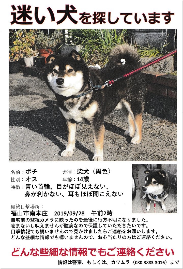 14歳の柴犬で、名前は「ポチ」。眼がほぼ見えなくて鼻も利かず耳もほぼ聞こえない…との事なんですけど、う〜ん、この冷たい時候の中を何処にいますのでしょうねぇ〜