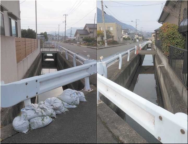 ふ〜ん、ボランティアの方が雑草ばかりでなく用水路底の土砂もキレイにされたのだ…と、またまた感心しておりました。土嚢の方は、後日、回収撤去されるのだろう…と思いながら(^-^)
