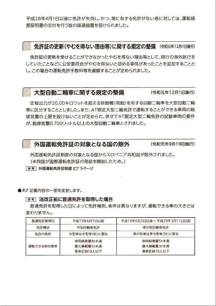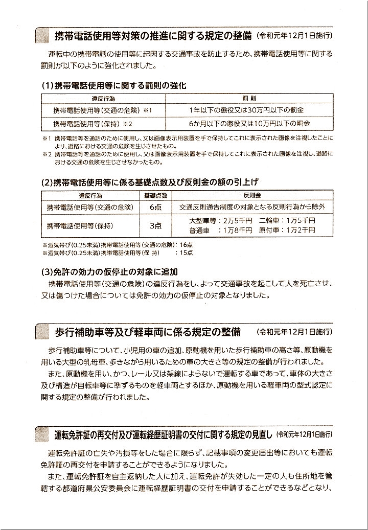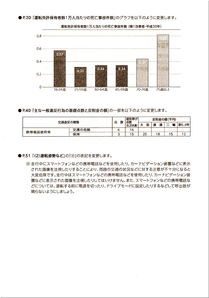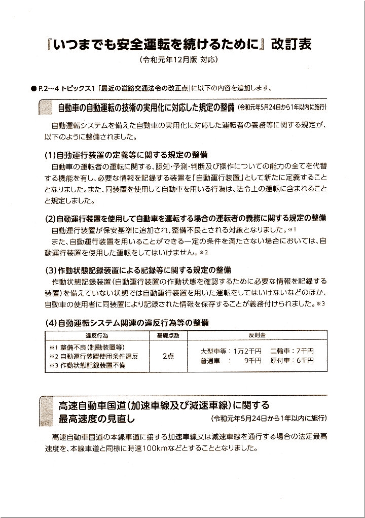 講習後には、「高齢者講習修了証明書」と、道路交通法令記載の「いつまでも安全運転を続けるために」のテキスト、そして、その「改訂表」を貰いました。