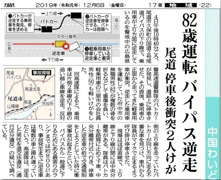 『82歳運転 バイパス逆走 尾道 停車後衝突2人ケガ』の見出しですから、イヤでも眼が止まります。