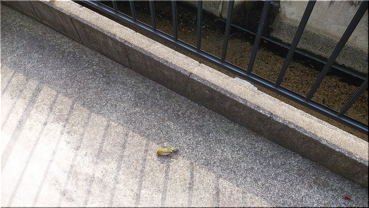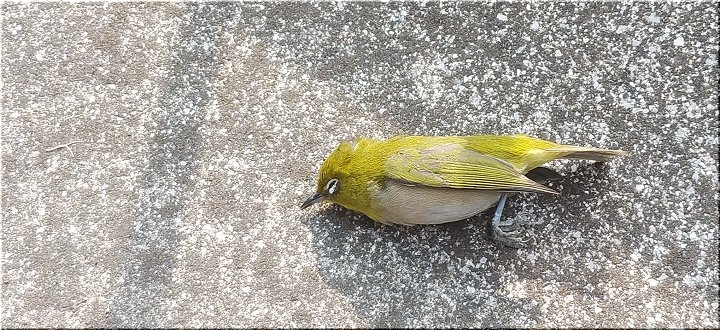 で、珍しくGONsanも掃き掃除。そぅしていましたら、駐車場の片隅にメジロが静かに横たわっておりました。