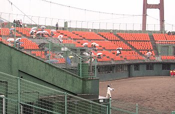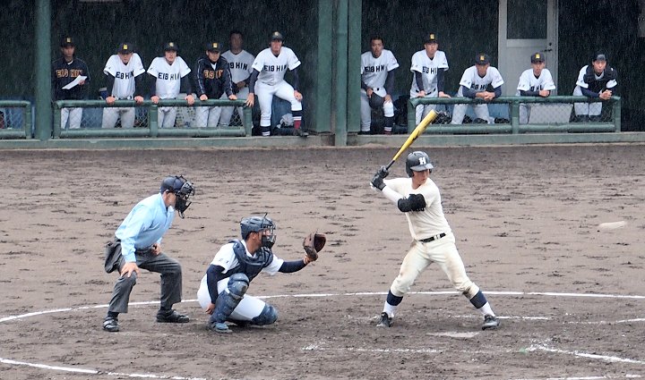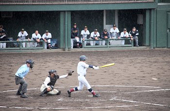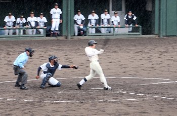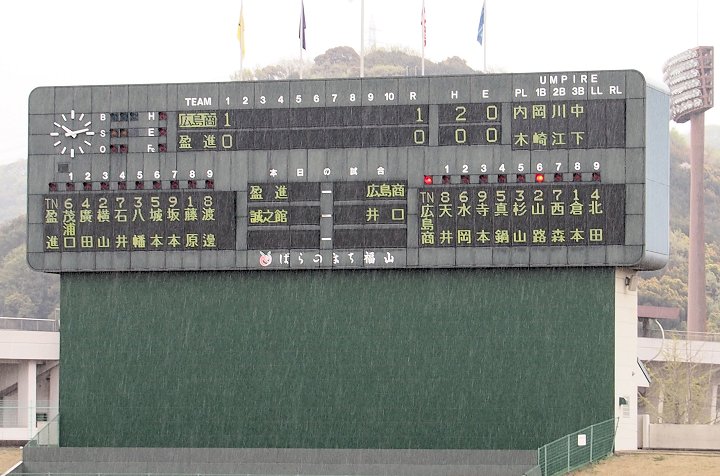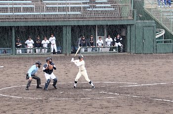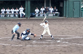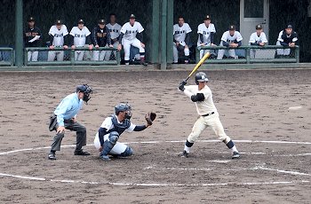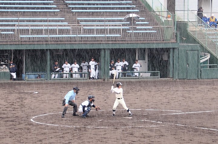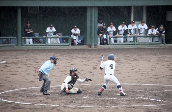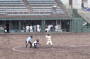 2点先取されました盈進高校ですけど、回が進みましても仲々得点は出来ません。小雨、時たま大粒の雨…と悪条件は広島商も同様です。