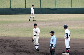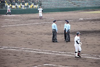 4回表の広島商の攻撃の時でしたか…試合中断かと思いましたけど、審判が集合。そして数分間協議です。