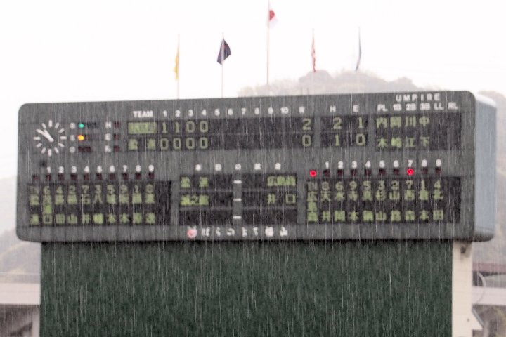 画像では降雨の状況はよく分かりませんけど、スコアボードを撮っています画像では、多少、降雨の状況が分かります。