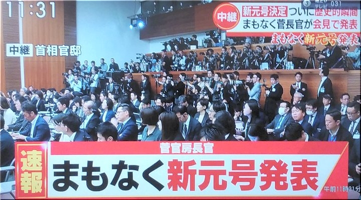 菅義偉官房長官が首相官邸の記者会見場に現れたのは、予告の時間から10分遅れた午前11時40分だった。「新しい元号は」と言った後、少し間を置いて「れいわであります」と続け、「令和」と紙に墨書された額を両手で1分以上掲げた。