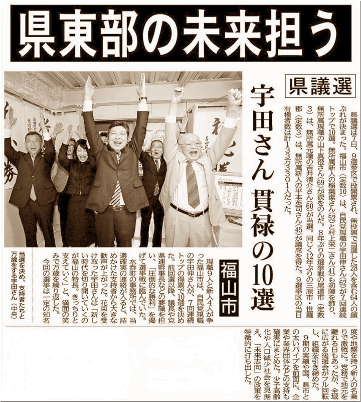 その日の夜、10:40頃でしたか…開票61%の段階で福山選挙区の当確速報が…今回もまた宇田伸sanのトップ当選が確実となりましたようですネ(^-^)