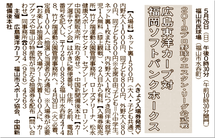 これも、本日の中国新聞朝刊記事に眼が止まりましたのですけど、ふん、ふん、5/26(日)に福山市民球場でウエスタンリーグの試合開催ですか…