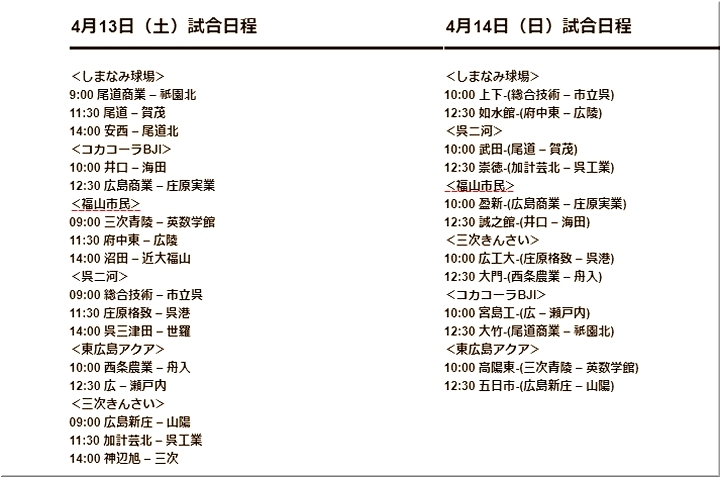 福山市民球場での4/13(土)・4/14(日)の日程を確認してみますと、下記の通りでありました。