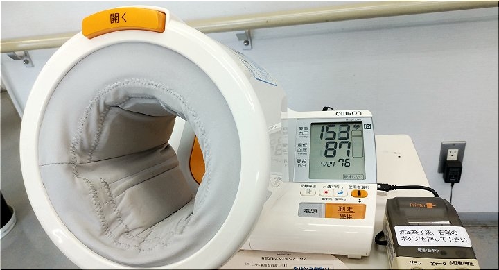 本日の数値は「153-87」でしたけど、大概、上が「180-160」で、下が「110-90」の測定数値。それで急いで、診察時に血圧の再測定を依頼しますと「115-80」ですからタマりません。