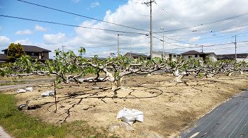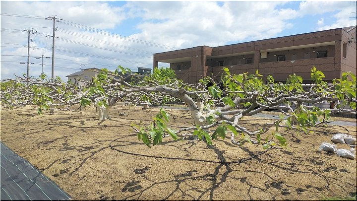 良く手入れされましたイチジク畑で、拝見していても気持ちがイィです。樹木が白いのは薬の散布によるものなのでしょうねぇ〜枝も見事に横に広げて…さぞ、美味しいイチジクが収穫出来るものと思います(^_^)v