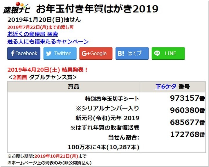 お年玉年賀ハガキの敗者復活戦…と言うか、ダブルチャンス賞の発表が4/20(土)であります事を、スッカリ忘れておりました(^-^;