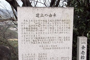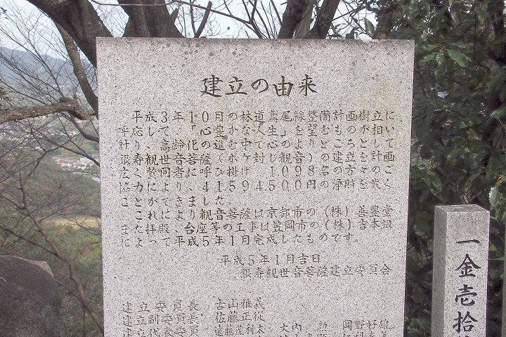 平成3年10月の林道鳶尾線整備計画樹立に呼応して、「心豊かな人生」を望むものが相い計り、高齢化の進む中で心のよりどころとして銀寿観世音菩薩(ボケ封じ観音)の建立を計画、広く賛同者に呼び掛け、1,098名の方々のご協力により、41,594,500円の浄財を戴くことができました。