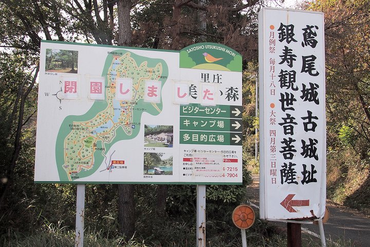 駐車場まで戻って来ますと、「銀寿観世音菩薩」「鳶尾城古城址」「里庄美しい森」に向かってみます事に。
