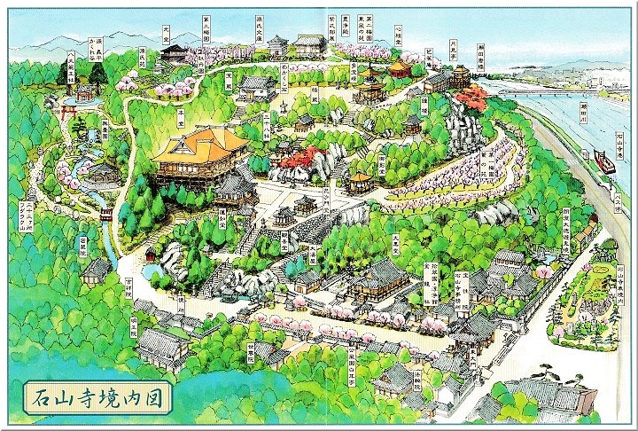 石山寺は、琵琶湖の南端近くに位置し、琵琶湖から唯一流れ出る瀬田川の右岸にある。本堂は国の天然記念物の珪灰石(「石山寺硅灰石」)という巨大な岩盤の上に建ち、これが寺名の由来ともなっている(石山寺珪灰石は日本の地質百選に選定)。