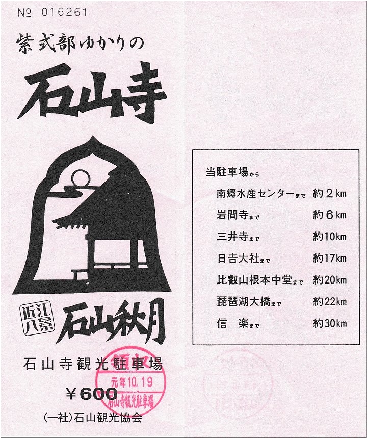 石山寺の駐車場に到着で、時間を確認しますと、12:58。3時間での到着を予定しておりましたけど、歳を重ねますと連続運転は苦痛ですし、何度か休息を入れながらの走行ですから、う〜ん、こんなもんかも分かりません(^-^)