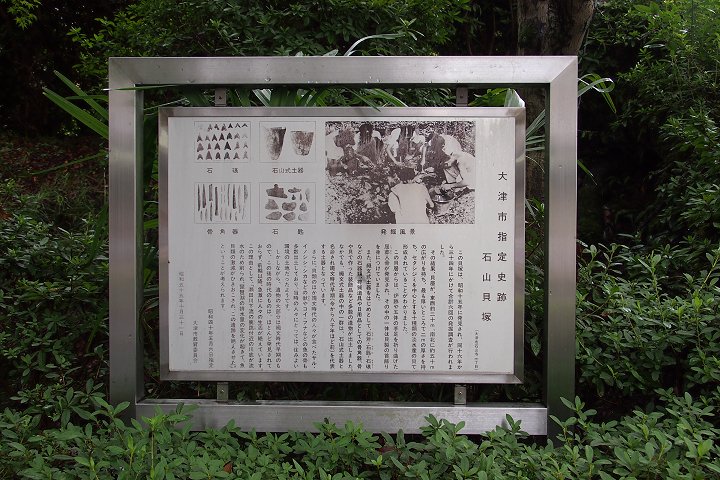 現在の石山寺の前あたりには、東西約20メートル、南北約50メートルにわたり貝層が堆積し、淡水産貝塚では日本最大の規模。貝層からは人骨や動物の骨など豊富な遺物が出土。石山観光会館にはぎとった貝層を展示。市指定史跡。