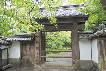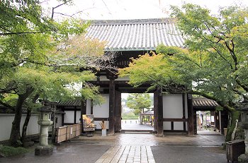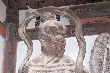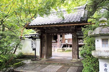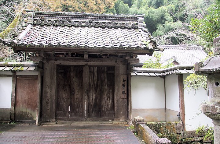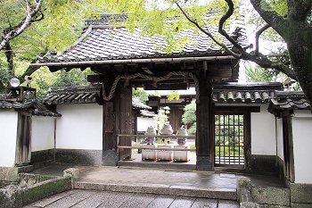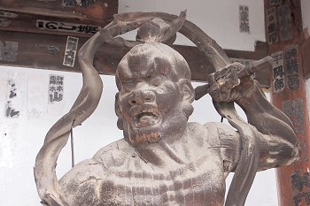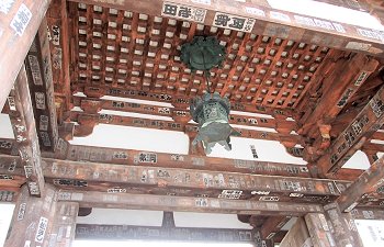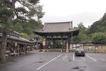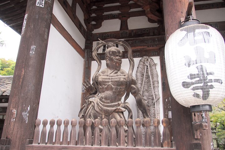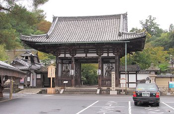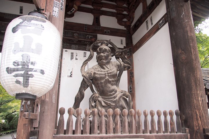 現存の門は、鎌倉時代の初期、建久元年(1190)の建築で、桃山時代の慶長年間(1596〜1615)にかなり大規模な修理改造が加えられています。天井下の蟇股(かえるまた)や破風(はふ)の懸魚(げぎょ)などに桃山時代の特徴がよく現れています。しかしながら、やはり建物の建ちが低く、深い軒は古寺の大門としてふさわしい姿をしています。