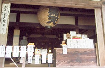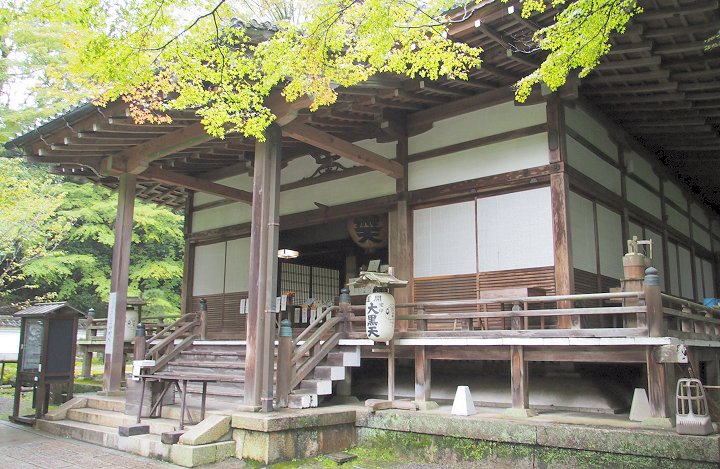 ・本堂(国宝)---正堂(しょうどう)、合の間、礼堂(らいどう)からなる複合建築である。構造的には正面7間、奥行4間(「間」は長さの単位ではなく、柱間の数を示す建築用語)の正堂と、正面9間、奥行4間の礼堂という2つの寄棟造建物の間を、奥行1間の「合の間」でつないだ形になり、平面は凸字形になる。正堂は承暦2年(1078年)の火災焼失後、永長元年(1096年)に再建されたもので、滋賀県下最古の建築である。内陣には本尊如意輪観音を安置する巨大な厨子がある。合の間と礼堂は淀殿の寄進で慶長7年(1602)に建立されたものである。合の間の東端は「紫式部源氏の間」と称され、執筆中の紫式部の像が安置されている。礼堂は傾斜地に建ち、正面は長い柱を多数立てて床を支える懸造(かけづくり)となっている。懸造の本堂は、清水寺、長谷寺など、観音を祀る寺院に多い。