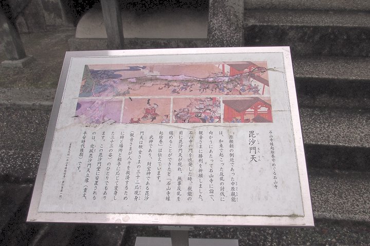 源頼朝の側近だった中原親能が反乱の討伐に向かうにあたって、石山寺に詣で、観音様に勝利を祈願し、石山寺の門から出発しようとしたところ毘沙門天が現れ、無事反乱を鎮めることができたと『石山寺縁起絵巻』に記されているそうです。