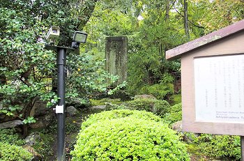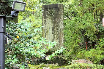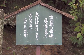 芭蕉の「あけぼのは まだむらさきに ほととぎす」の句碑。芭蕉は紫式部源氏の間を見て「紫」をかけて詠んでいる。
