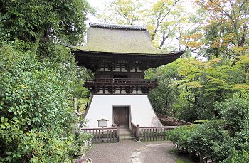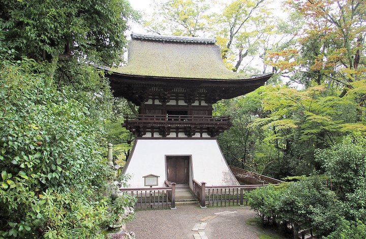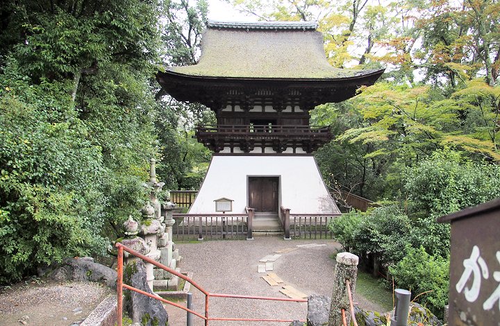 石山寺は大津市石山寺一丁目にあります。『滋賀県百科事典』によりますと、概要は「屋根は入母屋造桧皮葺(いりもやづくりひわだぶき)、袴腰(はかまごし)を漆喰塗(しっくいぬり)とした鐘楼で、鎌倉時代後期の建立とみられている。
