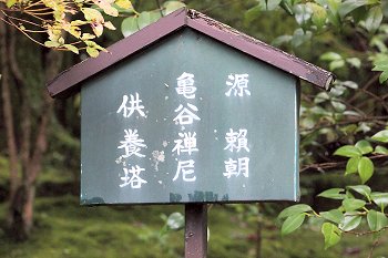 亀谷禅尼は源頼朝の第二の姫の乳母であり、石山寺の毘沙門天に戦勝祈願をした中原親能の妻です。剃髪後石山寺に住し石山の尼と呼ばれ、宝塔院を建立して本尊大日如来の胎内に頼朝の髪の毛を納めて日々勤行を為し、頼朝に石山寺の再興を勧め、多くの寺領を沙汰したと伝えられています。この二人のために、後世の人が供養塔を建立したと考えられ、亀谷禅尼供養塔は南北朝、源頼朝供養塔はそれに続く時期のものです。