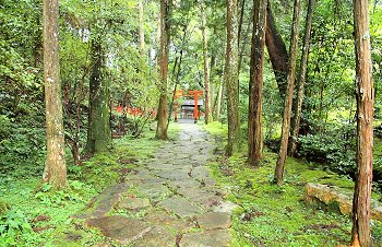 八大龍王社は、東大門から憂園のさらに奥へ進んだ場所に位置し、龍穴の中島に建てられています。龍穴は、炎天下でも請雨法を修すれば必ず雨が降るという池で、「石山寺縁起絵巻」には、石山寺の僧侶歴海和尚がここで孔雀経を転読すると、龍王たちが池の中から現れて和尚の傍らに侍り護衛し、和尚が草庵に戻る際には背負って行った様子が描かれています。和尚が読経の際いつも座っていた池の前の大きな丸い石は「歴海和尚尻懸石」と呼ばれています。