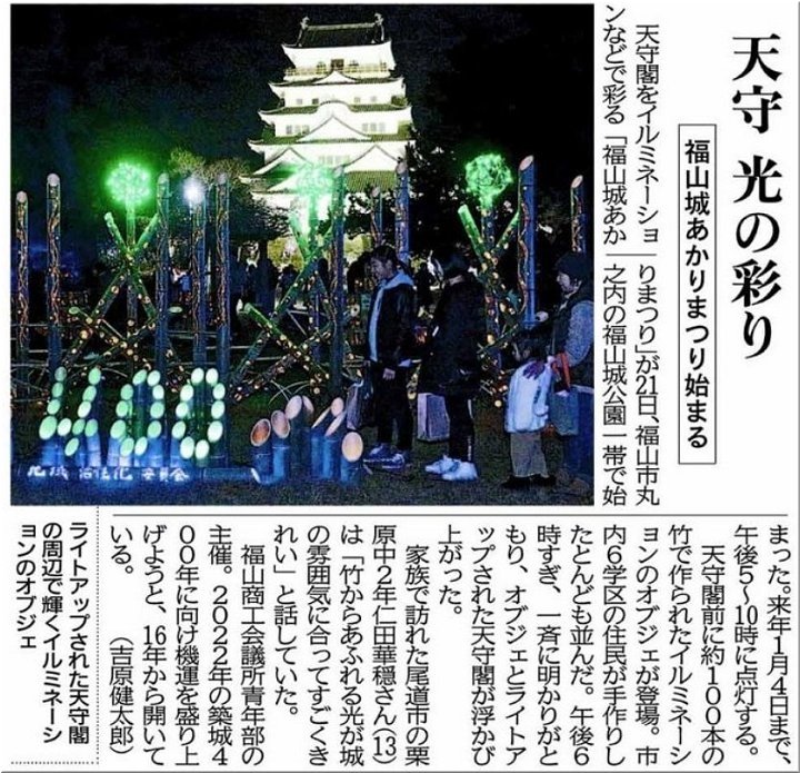 翌日の中国新聞朝刊には、「福山城あかりまつり」の様子が、こんな記事掲載で紹介されておりました(^-^)//"