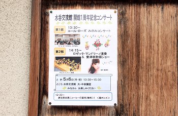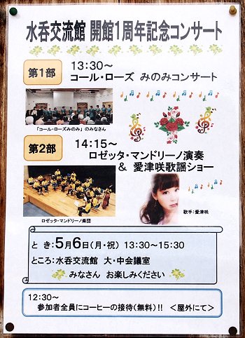 そぅしておりましたら、集会所の掲示板に「水呑交流館 開館1周年記念コンサート」のご案内が…そぅなんですねぇ〜水呑交流館が竣工し早や1年経ますのですネ(^_^)v